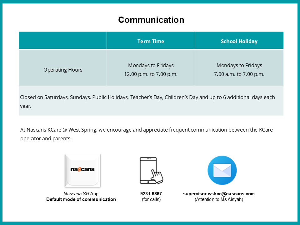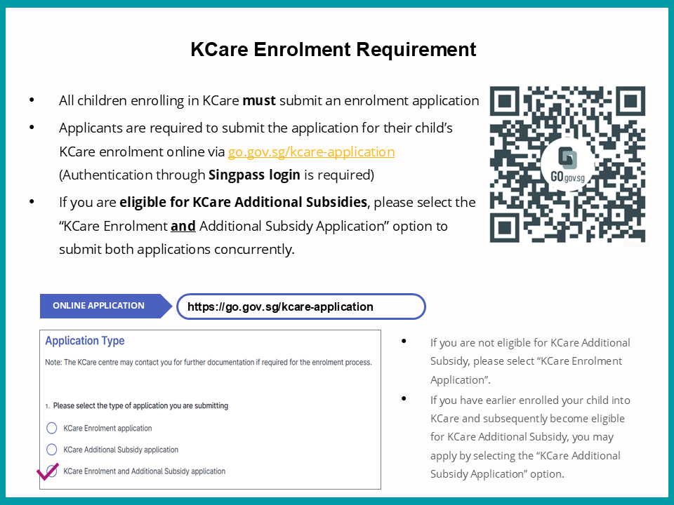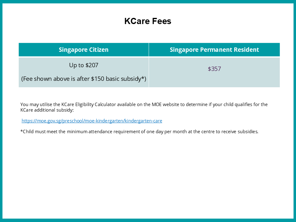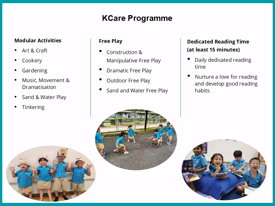 Kindergarten Care (KCare) is available in all MOE Kindergartens (MK) located within primary schools. If you register, your child can be in KCare after their MK session, providing the convenience of a full-day service.