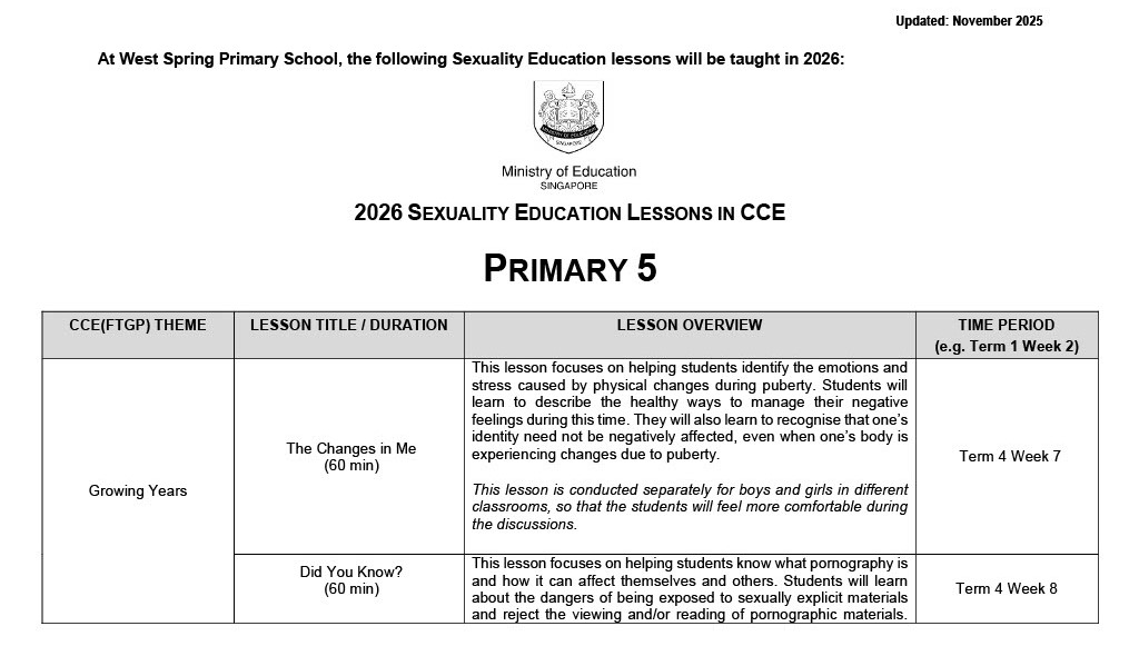 OVERVIEW OF WEST SPRING PRIMARY SCHOOL SEXUALITY EDUCATION PROGRAMME FOR 2026
